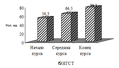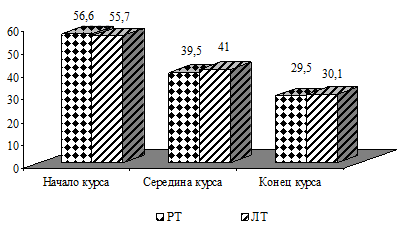 Уровень ситуативной и личностной тревожности в обследованной группе характеризовал наличие выраженной тревоги и составлял – 56,6±1,8 и 55,7±1,5 балла соответственно. Средний уровень, как ситуативной так и личной тревожности в середине курса свидетельствовал о умеренном уровне эмоционального напряжения.