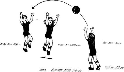 Поймай мяч. Дети делятся по трое. Двое из них располагаются друг против друга на расстоянии 3—4 м и перебрасывают мяч между собой. Третий становится между ними и старается поймать мяч или хотя бы коснуться его рукой. Если это удается, он меняется местами с тем, кто бросил мяч (рис. 37). Можно предложить детям перед броском выполнить какое-либо движение: бросить мяч вверх, вниз, поймать его, вести мяч на месте и т. д.