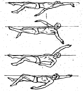 После прохождения вертикали сила тяги руки начинает; уменьшаться и с появлением плеча на поверхности воды исчезает. Поднимая локоть, пловец выводит руку из воды и маховым движением проносит ее по воздуху вперед.