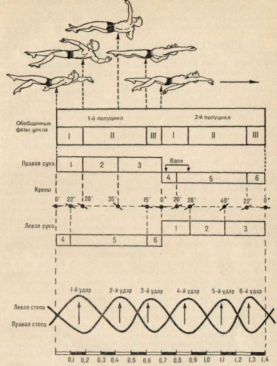Обобщенные фазы цикла: I - предварительная, II - главная, III - заключительная. Фазы движений рук: 1 - захват, 2 - подтягивание, 3 - отталкивание, 4 - выход из воды, 5 - движение над водой, 6 - вход в воду