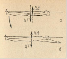 Если погружающая и выталкивающая силы приложены не по одной линии, то они образуют пару сил (рис.5, а). Обычно ОЦТ тела пловца (при положении на спине с вытянутыми вдоль туловища руками) расположен ближе к ногам, чем центр объема вытесненной воды (центр давления - ЦД). В этом положении нижняя часть тела опускается вниз. Чтобы сохранить горизонтальное положение (уравновеситься), следует руки вытянуть за головой, что переместит ОЦТ тела пловца к головной части тела (рис.5, б). Если в этой позе ноги опускаются вниз, можно приподнять кисти и предплечья над водой, в результате ЦД переместится к ногам, но тогда выталкивающая сила может оказаться меньше погружающей и пловец, уравновесившись, уйдет в воду глубже.