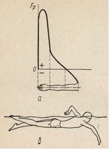 Учитывая поверхности звеньев руки и линейные скорости их движения при гребке, установили, что наибольший эффект дает кисть руки (рис.7, а). При некотором сгибании руки в локтевом суставе, а также сгибании и некотором отведении плеча в плечевом суставе создается характерная изогнутая форма руки с более отвесным положением в воде предплечья и кисти (высокое положение локтя) (рис.7, б). Надо полагать, что это положение, увеличивая поперечное сечение кисти и предплечья, способствует усилению гребка.