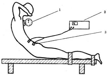 Рис. 1. Методика развития активной гибкости с использованием дополнительной афферентации: 1 - маятниковый гониометр, 2 - электростимулятор, 3 - накожные пластинчатые электроды 2х12 см