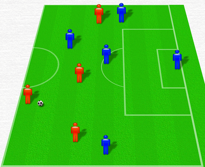 На рис. 3 изображен один из вариантов осуществления страховки. Футболист противника под номером “6” выполняет передачу “на ход” открывающемуся партнеру (№9). Защитник под номером “4” не успевает “закрыть” опасную зону; быстро оценив ситуацию, его страхует партнер по обороне (№3).