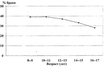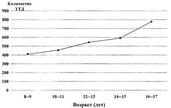 В работах А.П. Золотарева, А.И. Шамардина, А.А. Сучилина показано, что количественные и качественные характеристики ТТД у юных футболистов отличаются в зависимости от возраста (рис.1). Так, спортсмены 8-9 лет выполняют в среднем за игру 410±13,3 ТТД при браке 39,2+1,3 %. У 12-13 -летних футболистов эти показатели составляют соответственно 544±11,4 ТТД и 37,0+0,9 %. Объем ТТД у спортсменов 14-15 лет составляет 592±28,8 при браке 33,2+1,1 %. Спортсмены 16-17 лет выполняют за игру в среднем 778±35,7 ТТД с браком 28,0±1,8 %.