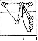 8. Шесть игроков располагаются в зонах 4, 2, 6 (нападающие), три игрока в колонне по одному между зонами 2–1 (связующие, рис. 6). Игрок зоны 4 передает мяч в зону 6, тот адресует его к сетке связующему (между зонами 3–2). Одновременно с передачей игрока зоны 6 связующий зоны 1 выбегает к сетке и выполняет передачу в зону 4 или 2, после чего переходит в зону 1 и становится в конец колонны связующих. Игроки зон 4, 2 опять направляют мяч в зону 6 и т.д.