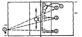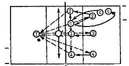 На первом этапе овладения выходами из тыловых зон необходимо, чтобы первая передача направлялась точно к сетке, между зонами 2–3. Передачи для удара связующий последовательно адресует каждому нападающему. Затем условия выходов и взаимодействий усложняют: направление первых передач варьируют, направление и траекторию вторых передач изменяют по заданию. Связующие последовательно овладевают навыками выходов из различных зон. Значительным усложнением данного упражнения является замена передач тренера подачами сначала с середины площадки, а затем с места подачи (рис. 8).