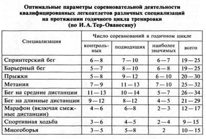 Все легкоатлеты должны моделировать, или, как говорят, "проигрывать", в тренировке возможные нагрузки и ситуации предстоящего состязания. При этом, конечно, надо учитывать особенности спортсмена и вида легкой атлетики, следует строго придерживаться в предсоревновательном микроцикле требуемого распорядка жизни и других требований предстоящих состязаний, а повторяя эти микроциклы, можно создать привычность на основе образования условно-рефлекторных связей. Опыт показывает, что в результате повторения сходных по режиму циклов можно достичь максимальной работоспособности именно в тот день и час недели, в который спортсмен будет участвовать в соревновании. В результате этого у спортсмена образуется мощная психологическая и функциональная настройка на высокий результат в определенное время. В таблице 1 приводится количество соревнований, в которых необходимо выступать в течение года квалифицированным легкоатлетам различных специализаций.
