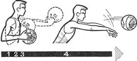 Передача двумя руками от груди(рис.5) —основной способ взаимодействия с партнером на коротком и среднем расстоянии. Для выполнения этой передачи игрок, заняв стойку для игры, держит мяч двумя руками перед грудью. При этом большие пальцы направлены друг к другу, остальные — вверх-вперед. Руки согнуты, локти обращены вниз. Для выполнения замаха руки с мячом описывают небольшое кругообразное движение вниз-назад-вверх, кисти разгибаются. Затем руки резко выпрямляются, толкая мяч от груди в направлении цели. Бросок заканчивается активным сгибанием кистей и разгибанием ног.