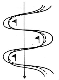 Лыжник на повороте испытывает большую нагрузку. Суммарная перегрузка превышает 2g, то есть примерно равна удвоенному весу лыжника. Причем падает она в основном на «внешнею» ногу (попытка встать на внутреннюю лыжу, обычно заканчивается падением). Почему лыжника, скатывающегося с горы, нельзя уподобить, скажем, бусинке, соскальзывающей по гладкой изогнутой проволоке? В первую очередь, потому, что он сам выбирает маршрут движения в коридоре, заданном флагами (у саночников - желобом). Спортсмену (даже если считать его материальной точкой) предстоит найти оптимальную траекторию, в то время как движение бусинки чисто одномерное. Вид оптимальной траектории определяется сочетанием целого ряда факторов. Прежде всего, желательно пройти трассу кратчайшим путем, как можно меньше уклоняясь от линии склона (рис.2). При этом мы выигрываем не только из-за сокращения расстояния, но и за счет увеличения средней крутизны маршрута – чем круче склон, тем больше скатывающая сила и тем меньше сила трения. В то время как идеальная линия уже обозначена флажками, слаломисты стараются идти как можно ближе к флагам, отбивая их плечом и корпусом.