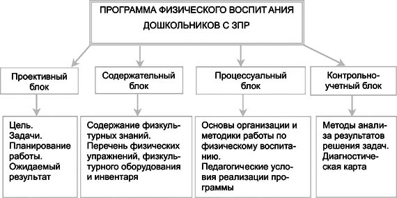 Разработанная и реализованная в условиях ДОУ № 113, 131, 138, 179, 217 г. Краснодара авторская программа физического воспитания детей 5-6 лет с ЗПР включает в себя 4 взаимосвязанных блока: проективный, содержательный, процессуальный и контрольно-учетный (см. рисунок).
