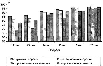 Рис. 5. Показатели двигательных способностей футболистов разного возраста в % от данных по 18-летних спортсменов (100%)