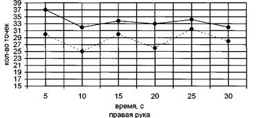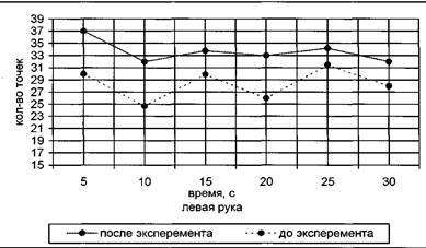 Рассмотрев полученные данные можно сделать следующие заключения: достоверно повысилась частота и стабильность скоростной мануальной координации (рис. 14) как правой, так и левой руки;