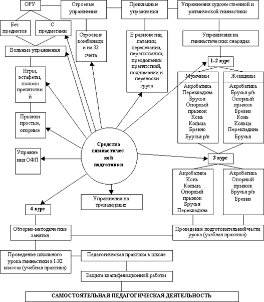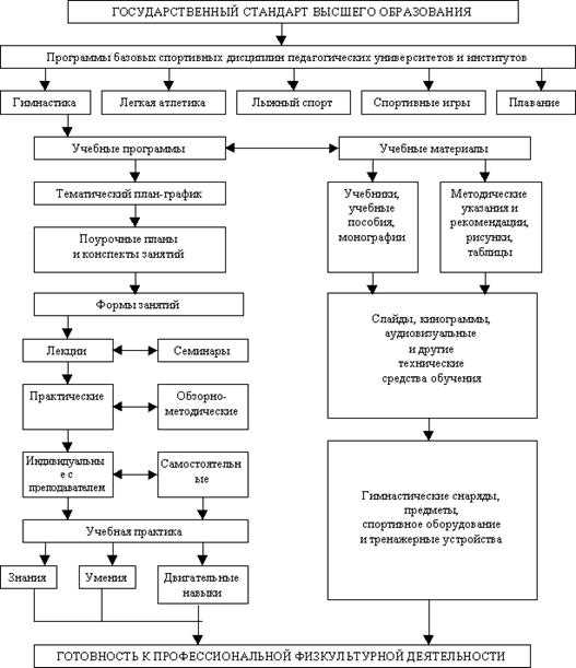 Представленная выше схема физкультурного образования будущих учителей физической культуры на примере гимнастики в настоящем исследовании основывается на Государственном образовательном стандарте и базовых программах спортивных дисциплин педагогических вузов.