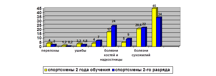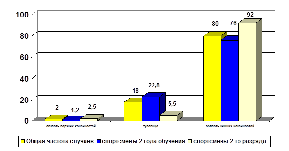 Анализируя данные ЦРБ, стало ясно, что нижние конечности, по сравнению с другими звеньями двигательной системы, испытывают значительно большие тренировочные и соревновательные нагрузки, что и объясняет преимущественную заинтересованность миоэнтезического и капсульно-связочного аппарата. Травмы нижних конечностей составляют наибольший процент от общего количества травм и повреждений, и приходится в основном на соревновательный период. На втором месте травмы туловища, головы и шеи, они наблюдаются в большинстве случаев у спортсменов 2 года обучения. Затем следуют травмы верхних конечностей. Хронические заболевания и повреждения наблюдаются в основном у спортсменов (2-го разряда). У спортсменов 2 года обучения наиболее характерны травмы острого характера.