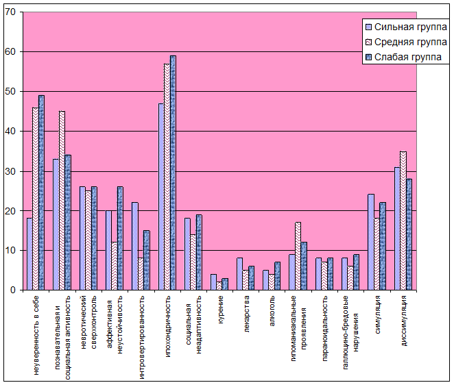 В группе сильных спортсменок по ОНР обнаруживается занижение показателей личностных шкал, которые прогностически отвечают за формирование невроза. Занижение показателей может говорить о том, что спортсменки вытесняют те признаки, так или иначе указывающие на патологию. Занижение обнаруживается практически по всем личностным шкалам: неуверенность в себе, познавательная и социальная пассивность, невротический «сверх-контроль», аффективная неустойчивость, интровертированная направленность личности, социальная неадаптивность, за исключением некоторого повышения на этом фоне ипохондрии.