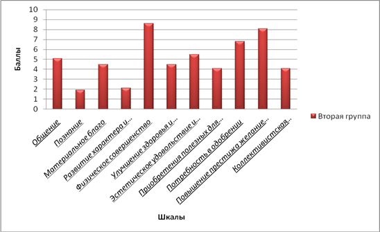Рис.2. Средние показатели по методике «Изучение мотивов занятий спортом» В.И. Тропникова, во второй группе испытуемых