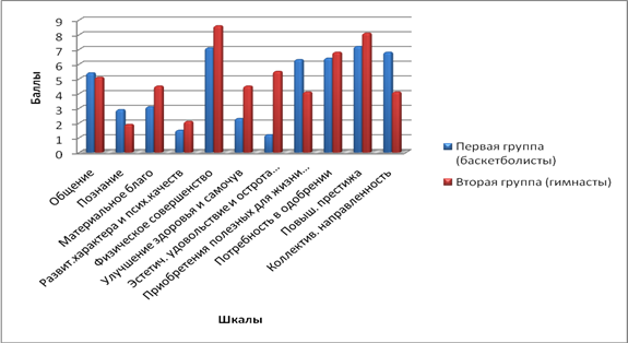 Рис. 3 Средние показатели по методике «Изучение мотивов занятий спортом» В.И. Тропникова, в группах испытуемых