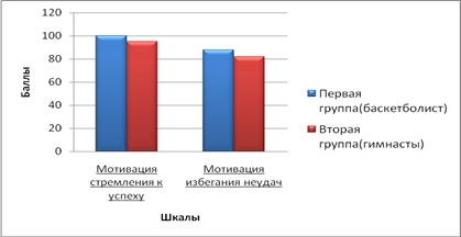 Рис. 4. Показатели по методике «Диагностики мотивации достижения» А. Мехрабиан в 1 и 2 группе испытуемых