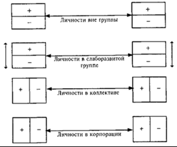 Отношения в группах закономерно изменяются. Сначала, на исходном этапе развития, они бывают относительно безразличными, затем могут становиться конфликтными, а при благоприятных условиях превращаться в коллективистские.