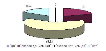 В ходе проведенного исследования было выявлено, что большее количество респондентов не удовлетворены современным состоянием дел в области физической культуры и спорта в Нижнекамском муниципальном районе. Мнение участников опроса свидетельствует о том, что организация физкультурно-оздоровительной работы с молодежью в Нижнекамском муниципальном районе не в полной мере соответствует нормам сегодняшнего дня. Об этом свидетельствуют результаты ответов на первый вопрос предложенной анкеты. Результаты представлены на рисунке 2.3.1.