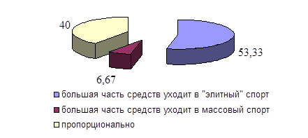 Кроме того, респондентами отмечается, что большая часть денежных средств расходуется на финансирование "элитных" видов спорта, таких, как хоккей и футбол, оставляя на развитие массовых видов спорта лишь незначительную часть (рисунок 20).