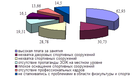 Далее, наиболее острыми опрошенные считают следующие проблемы: высокая плата за занятия (62,93%), нехватка дворовых спортивных сооружений (30,73%), нехватка спортивных сооружений (28,78%), а также отсутствие пропаганды здорового образа жизни на местном уровне (19,51%), плохое оснащение спортивных сооружений (16,1%) и отсутствие профессиональных кадров (13,66%) 14,5% респондентов не сталкивались с проблемами в области физической культуры и спорта (рисунок 25).