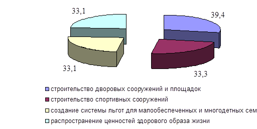 В качестве мер по решению данных проблем жители города предлагают: строительство дворовых сооружений и площадок - 39,4%; строительство спортивных сооружений - 33,3%, создание системы льгот для малообеспеченных и многодетных семей, а также распространение ценностей здорового образа жизни по 33,1% (рисунок 26).