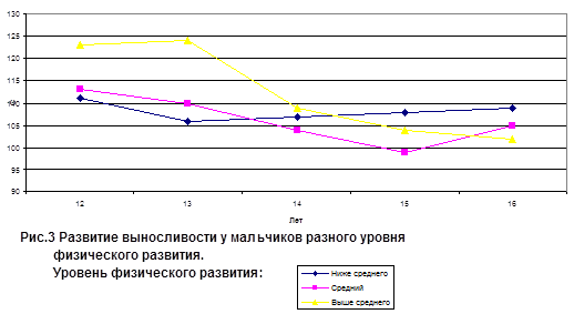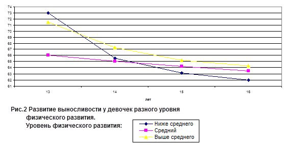 В подростковом возрасте (13-14 лет) более выносливы школьницы среднего физического развития, в старшем (15-17 лет) – замедленного, а в 16 лет – ускоренного. При этом в 13 лет показатели выносливости школьниц среднего уровня достоверно лучше показателей представительниц других уровней.