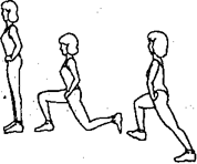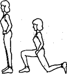 Стоя, ноги врозь, руки на талии. Сделайте выпад вперед, чтобы нога была под углом 90°. Вернитесь в исходное положение, слегка оттолкнувшись впереди стоящей ногой. |