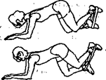 Варианты: Стоя, руки на поясе, отведение прямой ноги назад с сопротивлением. Стоя на локтях и коленях, равномерно распределив массу тела. Поднимите вверх согнутую в колене ногу, пока задняя линия бедра не встанет параллельно полу, подошва смотрит точно вверх. Нажимая на пятку, выпрямите поднятую вверх ногу, согните ногу в колене, вернитесь в исходное положение. То же другой ногой. |