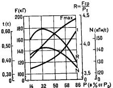 Рис.4 Изменение максимума силы (Ртах), времени движения (<), коэффициента реактивности (Я) и мощности работы (N) при выпрыгивании со штангой увеличивающегося веса на плечах (в процентах от максимального) |