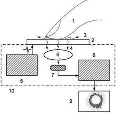 Рис. 1а. Схематическое изображение ГВР прибора. 1 - объект исследования; 2 - прозрачный электрод; 3 - газовый разряд; 4 - оптическое излучение; 5 - генератор; 6 - оптическая система; 7,8 - видеопреобразователь; 9 - компьютер; 10 - корпус