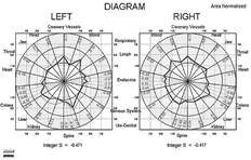 Для характеристики БЭО-грамм используются следующие показатели: площадь газоразрядного изображения, нормализованная площадь, интегральный коэффициент площади, энтропия изображения и коэффициент фрактальности. Исследуются значения этих показателей для каждого пальца руки, средние значения показателей для пальцев обеих рук и отдельно для правой и левой, определяются величины параметров в секторах проекционных зон функциональных систем, предложенных P. Mandel (1986) в модификации К.Г. Короткова [15] (рис.1 б). У практически здоровых людей величины колебаний параметров БЭО-грамм (среднесуточная и средняя 10-минутная) составляют соответственно 6,6 и 4,1%. Сформированный в ходе совместных исследований со специалистами США, Швеции, Финляндии и Словакии банк данных позволил определить зону нормы для вышеуказанных параметров БЭО-грамм, характерных для практически здоровых людей разных возрастных групп и пола [16].