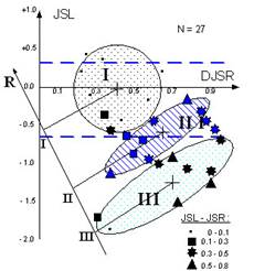 Рис. 2б. Результаты кластерного анализа для группы высококвалифицированных спортсменов УОР-2 С.-Петербурга (директор - И.И. Комаров). По осям отложены ГРВ параметр JSL для левой руки и дисперсия этого параметра DJSR для правой руки. Ось R представляет рейтинг спортсменов по результатам годового соревновательного цикла. Видно, что разделение спортсменов на группы по величине ГРВ параметров коррелирует с эффективностью соревнова тельной деятельности