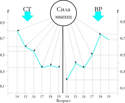 Выявлены закономерности приростов результатов при педагогическом тестировании, а также сроки формирования умений и навыков в выполнении двигательных тестов. Период усиленного роста длиннотных размеров конечностей сопровождается нарушением координации движений и снижением прироста скоростно-силовых и росто-весовых показателей [17, 24]. В препубертатном периоде отмечаются высокие корреляционные связи габаритных показателей с результатами силовых и скоростно-силовых упражнений, в пубертатном периоде усиливается влияние варианта развития (рис.1).