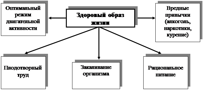 К основным компонентам здорового образа жизни относятся: рациональное питание, быт, организация труда и отдыха, отношение к вредным привычкам (Лаптев А.П., Полиевский С.А., 1990).