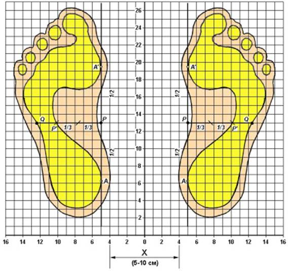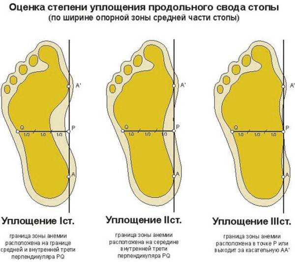 Оценка степени уплощения делается по расположению границ зоны анемии в среднем отделе стопы по отношению к третям перпендикуляра PQ.