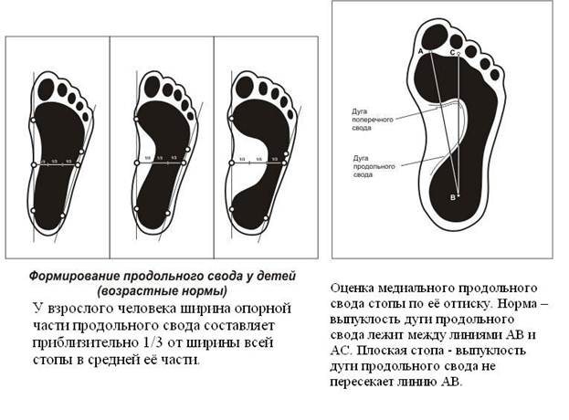 У новорожденного своды стопы отсутствуют (так же, как и физиологические изгибы позвоночного столба). Начало формирования сводов стопы связано с началом прямохождения. У взрослого человека ширина опорной части продольного свода в норме составляет приблизительно от ширины всей стопы в средней её части.
