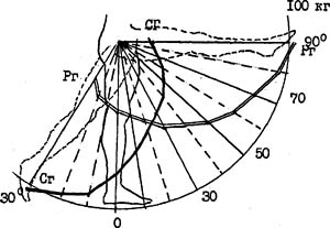 Разность силы мышц в их крайних состояниях при сгибании тазобедренного сустава достигает 68,4 кГс, а при разгибании - 49,8 кГс (см. табл. 2). Наиболее выраженное различие в силе характерно для поясничного отдела позвоночного столба - 43 и 98 кГс соответственно. Коэффициент вариации (КВ) силы, действующей на изученные суставы в зависимости от изменения суставных углов, изменяется в широких пределах. По его значениям можно судить только о подготовленности мышц работать в определенных углах, что создается длительной тренировкой при выполнении ими "рабочего движения" или привычной бытовой работой у лиц, не занимающихся спортом.