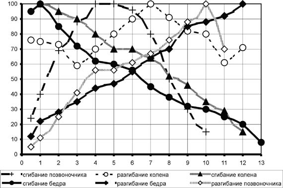 Рис. 2. Изменение силы мышц в процентах от максимальной силы, показанной при изменении суставного угла на 10°