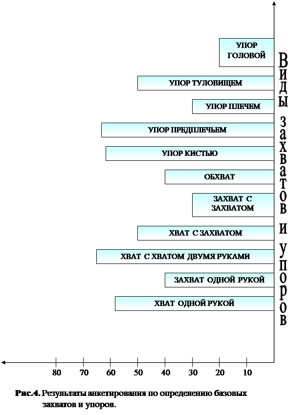 На основе анализа данных, полученных при анкетировании, мы смогли ответить на некоторые важные вопросы базового этапа технико-тактической подготовки дзюдоистов. Прежде всего мы определили на основании мнения тренеров и специалистов срок обучения базовой техники. По их мнению он составляет 2 года (такая величина получена как средняя арифметическая всех ответов).Далее, при помощи того же метода нахождения среднего арифметического, было определено количество коронных приемов – 4 и количество вспомогательных – 6.