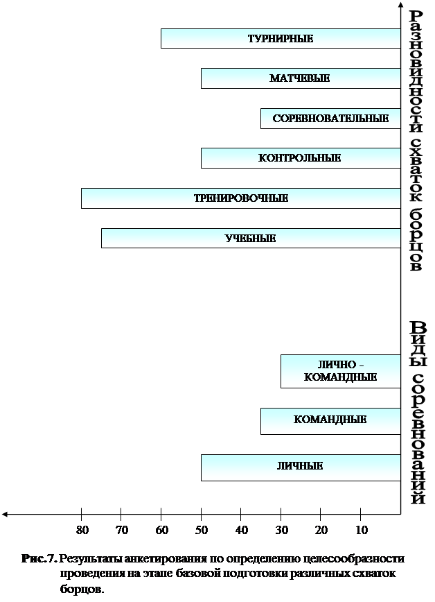 Тренеры считают (рис.7), что в первые два года обучения дзюдоисты не должны принимать участие в соревнованиях, а только в учебных (74) и тренировочных (76) схватках. Кроме того, тренеры считают необходимым обучать бросать в разные стороны (76) и обучать элементам защиты (58).