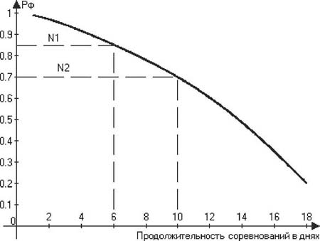 Как видно из номограммы на рис. 3, при продолжительности соревнований 6 дней (пунктирная линия N1) функциональная надежность физиологических систем спортсмена имеет весьма устойчивый уровень (Рф=0,85), при увеличении продолжительности соревнований до 10 дней (пунктирная линия N2) уровень надежности физиологических систем снижается, но еще соответствует устойчивому уровню (Рф=0,7). Отметим, что эти сроки продолжительности соревнований были установлены эмпирически - соревнования регионального и международного уровней продолжаются, как правило, не более 6 дней, а Олимпийские игры - 10 дней. Соответствие эмпирически рассмотренных спортивных соревнований на основе векового опыта (олимпийское движение) со сроками, найденными с помощью информационно-вероятностной методики, подтверждает, что последняя правильно отражает сложные процессы динамики функциональной надежности организма спортсменов. Эта надежность прежде всего обусловлена физическими и психоэмоциональными нагрузками, свойственными всей спортивной деятельности.