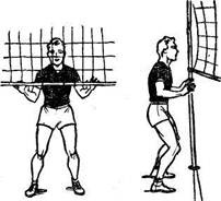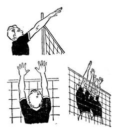 Перемещения выполняются различными способами вдоль сетки, взгляд направлен на мяч и игрока противника. Определив место прыжка, блокирующий занимает исходное положение, в котором ноги согнуты, руки согнуты в локтях, ладони на уровне пояса (или у груди), туловище слегка наклонено (рис. 9). Прыжок выполняется резким выпрямлением ног и махом согнутых рук. Руки переносятся вверх между туловищем и сеткой и поднимается над сеткой. Расстояние между ладонями должно быть меньше диаметра мяча, чтобы он не выскочил между ними. Предплечья ставятся как можно ближе к сетке, чтобы мяч не прошел между сеткой и руками. Блокирующий смотрит на нападающего игрока, чтобы определить направление удара.