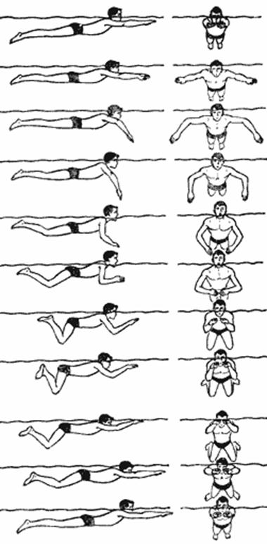 Каждый цикл движений в этом способе состоит из одного движения рук, одного движения ног, одного вдоха и одного выдоха в воду.