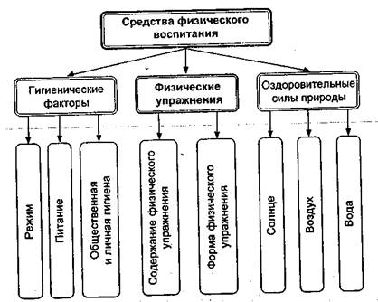 Для достижения цели физического воспитания применяются следующие группы средств: 1) физические упражнения; 2) оздоровительные силы природы; 3) гигиенические факторы. Основным специфическим средством физического воспитания являются физические упражнения, вспомогательными средствами – оздоровительные силы природы и гигиенические факторы. Комплексное использование этих средств позволяет специалистам по физической культуре и спорту эффективно решать оздоровительные, образовательные и воспитательные задачи. Все средства физического воспитания можно отобразить в виде схемы: