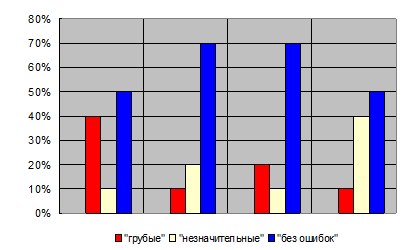 В контрольном тестировании по сравнению с исходным средний показатель времени выполнения задания улучшился на 25,1 сек. Оценка за выполнение задания увеличилась на 0,7 балла. Ошибки допустили только 3 юных спортсмена, повторяющихся ошибок не обнаружено. Всё сказанное выше позволило предположить, что обучение правильному выполнению задания экспериментальной группе свидетельствует о достаточно высокой эффективности применяемых средств. Ошибки «незначительные», можно обосновать механической неаккуратностью при переносе КП. В элементе «Развитие наблюдательности и памяти» в экспериментальной группе количество «грубых» ошибок уменьшились с 40% до 10%, «незначительные» увеличились на 10%, число результатов «без ошибок» также имеет тенденцию к увеличению с 50% до 70%.