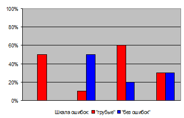 Рис.2. Диаграмма процентного соотношения ошибок в экспериментальной и контрольной группах в техническом элементе «Определение и контроль направления».