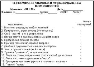 Процедура тестирования проводится следующим образом. Участники тестируемой группы заполняют в индивидуальных протоколах тестирования (рис. 2) графы "Фамилия", "Группа", "ЧСС покоя". Преподаватель показывает тестовые упражнения, перечисленные в протоколе, и участники повторяют их по 2 - 3 раза для ознакомления. Выполнение теста начинают все одновременно по команде преподавателя. После выполнения очередного упражнения каждый участник самостоятельно фиксирует в протоколе количество повторений. Через 30 с после окончания комплекса все участники одновременно измеряют значение ЧСС нагрузки (в течение 15 с) и полученные цифры вносят в свои протоколы.